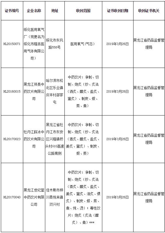 黑龍江省藥監(jiān)局收回4家企業(yè)藥品GMP證書
