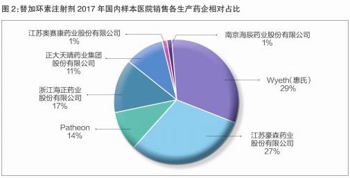 2017年,替加環(huán)素進(jìn)口產(chǎn)品的市場份額為43%,下降明顯;國產(chǎn)產(chǎn)品的市場份額上升明顯,其中,江蘇豪森藥業(yè)2017年的市場份額增至27%;另一家市場份額一直在上升的國內(nèi)藥企為正大天晴,2017年市場份額占比為11%。估計(jì)這種趨勢后續(xù)將更加明顯(見圖2)。