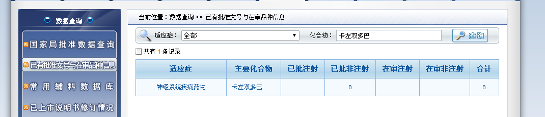 此外,記者查詢國(guó)家藥監(jiān)局藥品審評(píng)中心官網(wǎng)發(fā)現(xiàn),適應(yīng)證為神經(jīng)系統(tǒng)疾病藥物、主要化合物為卡左雙多巴的已批非注射劑有8個(gè),目前沒有在審的產(chǎn)品。