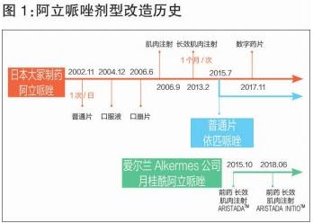 劑型不斷改進,降低用藥頻率 因為特殊的用藥人群,提高患者的依從性一直是抗精神病藥物的關(guān)注重點。阿立哌唑從誕生之日起就不斷被改造劑型,隨著劑型不斷改良,用藥頻率也從最初的每日1次改為后來的1月1次,患者的順應(yīng)性大大提升。