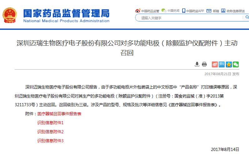 2017年8月21日,國家藥品監(jiān)管部門官網(wǎng)發(fā)布《深圳邁瑞生物醫(yī)療電子股份有限公司對多功能電極(除顫監(jiān)護儀配附件)主動召回》信息(信息鏈接為http://www.nmpa.gov.cn/WS04/CL2135/321102.html),“深圳邁瑞生物醫(yī)療電子股份有限公司報告,由于多功能電極片外包裝袋上的中文標(biāo)簽中“產(chǎn)品名稱”打印錯誤等原因,深圳邁瑞生物醫(yī)療電子股份有限公司對其生產(chǎn)的多功能電極(除顫監(jiān)護儀配附件)(注冊號:國食藥監(jiān)械(準(zhǔn))字2013第3211733號)主動召回,召回級別三級?!?/p>