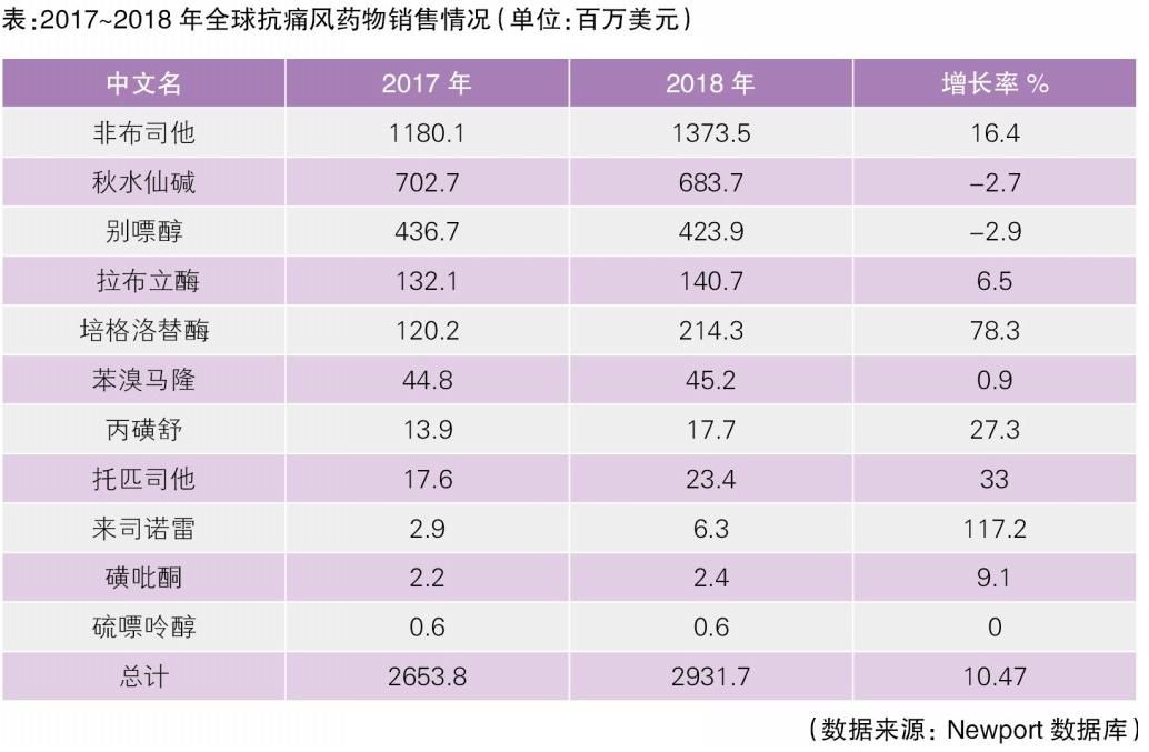 據(jù)Newport數(shù)據(jù),2017~2018年,全球11種主要抗痛風(fēng)藥物的銷(xiāo)售額合計(jì)已達(dá)29.3億美元,同比增長(zhǎng)10.47%。其中,非布司他、秋水仙堿和別嘌醇的銷(xiāo)售額排在前三,而非布司他、培格洛替酶、托匹司他和來(lái)司諾雷的增長(zhǎng)勢(shì)頭明顯(見(jiàn)表)。國(guó)內(nèi)市場(chǎng)方面,據(jù)米內(nèi)數(shù)據(jù)顯示,2017年我國(guó)城市公立醫(yī)院抗痛風(fēng)藥物的銷(xiāo)售額已達(dá)7.79億元,同比增長(zhǎng)65.57%,2013~2017年復(fù)合增長(zhǎng)率高達(dá)43.3%。盡管該治療領(lǐng)域市場(chǎng)規(guī)模較小,但該領(lǐng)域具有較大的市場(chǎng)潛力。