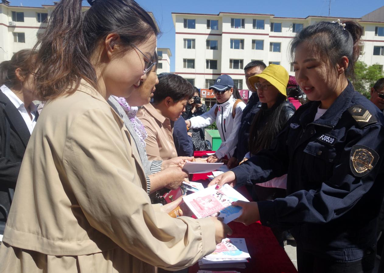 內(nèi)蒙古自治區(qū)化妝品安全科普宣傳周啟動(dòng)儀式現(xiàn)場,工作人員正在發(fā)放科普宣傳資料。 楊燕/攝