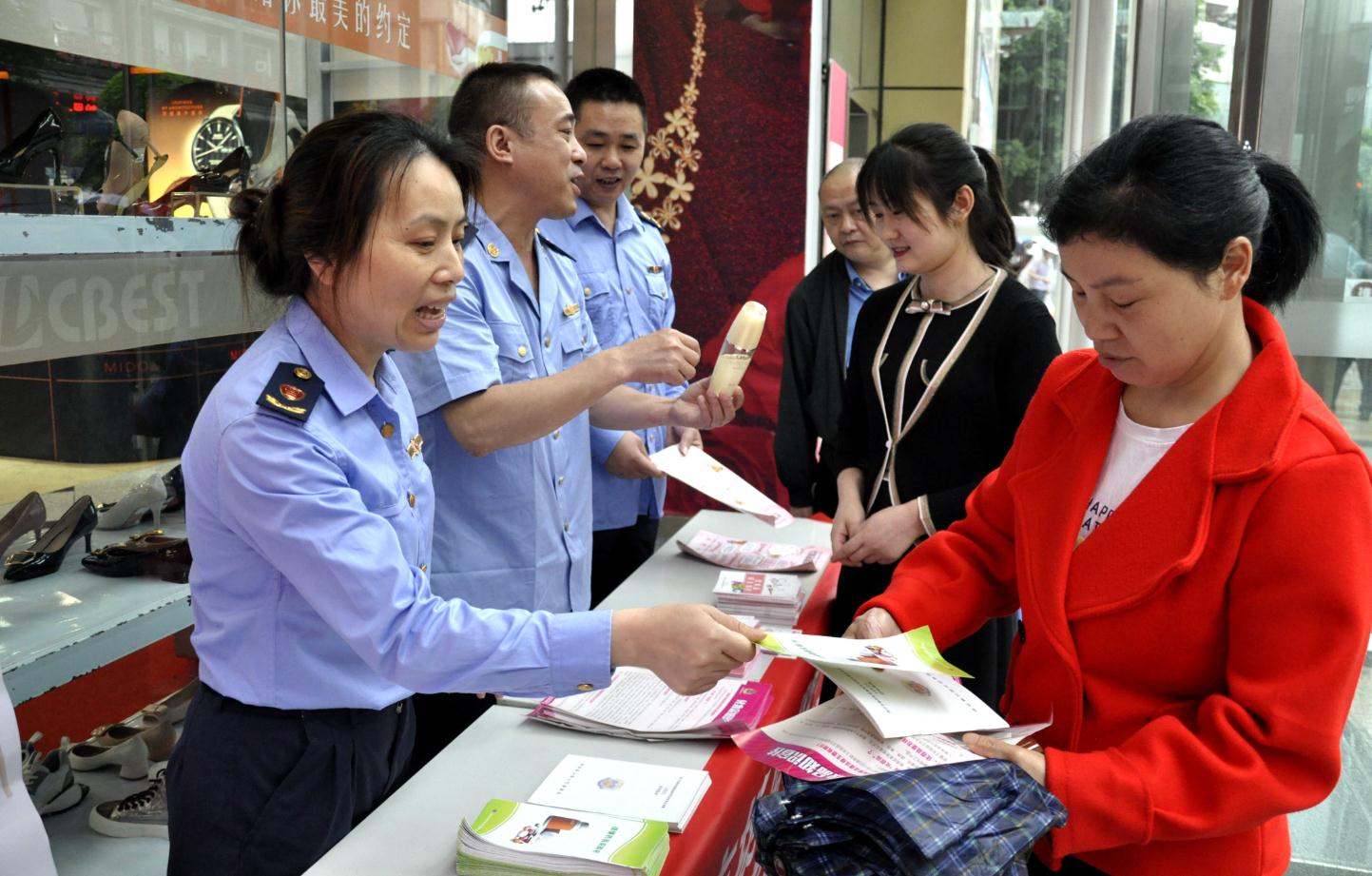 圖為該局敦仁街道市場監(jiān)管所執(zhí)法人員在敦仁商圈設立宣傳站,面對面向群眾講解如何鑒別真假化妝品。文光輝 攝影報道