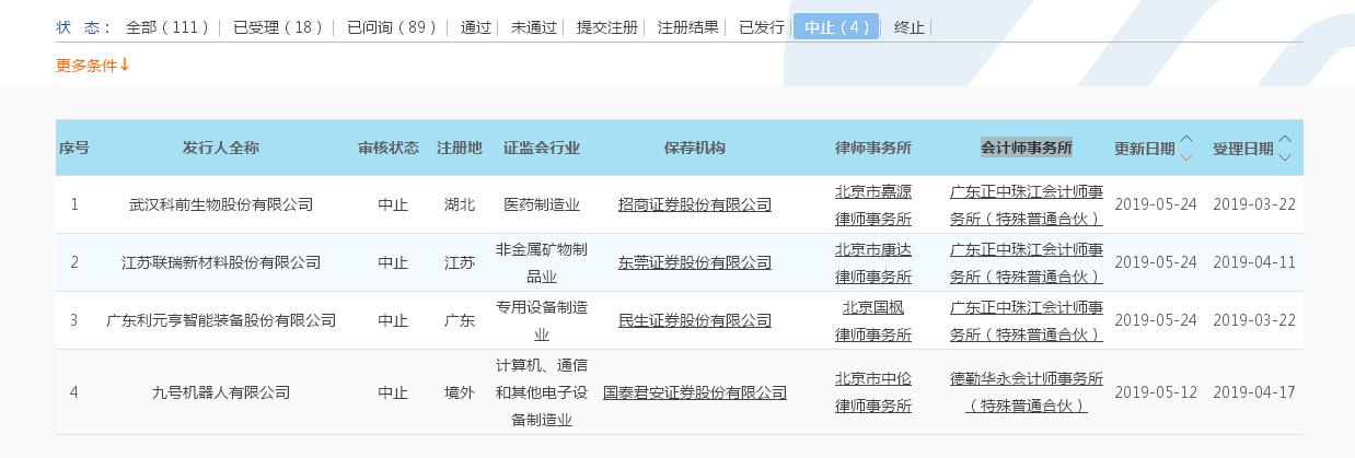 上交所5月24日中止審核的三家企業(yè),會計師事務所均為正中珠江會計師事務所。