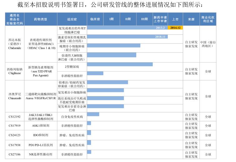 微芯生物目前僅有西達(dá)本胺一個產(chǎn)品上市。該品上市后,公司收入和利潤規(guī)模迅速提升,2016年、2017年和2018年,西達(dá)本胺片的產(chǎn)品銷售收入和西達(dá)本胺境外專利授權(quán)許可收入的合計分別為8529.96萬元、11028.87萬元和14651.14萬元,占公司同期營業(yè)收入的比例分別為99.92%、99.81%和99.20%。此外,該公司目前具有14個在研項目儲備。