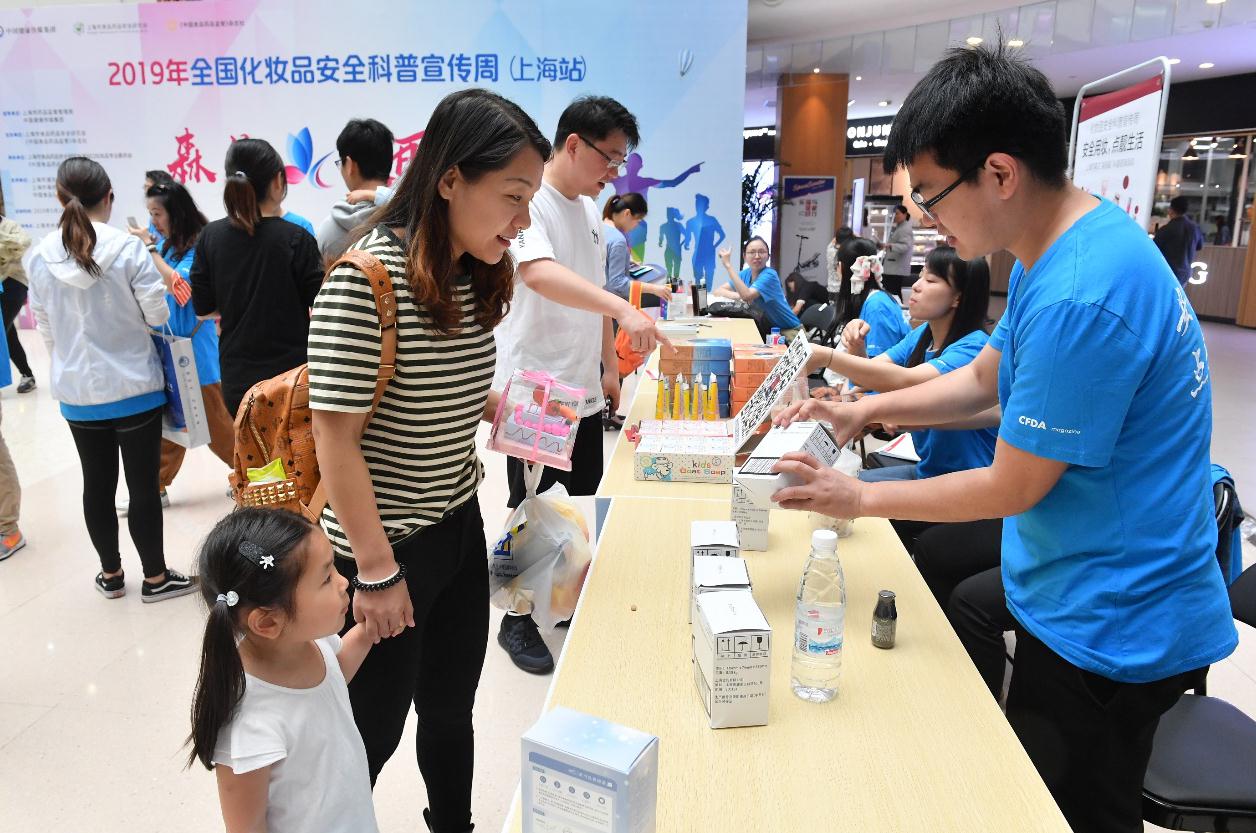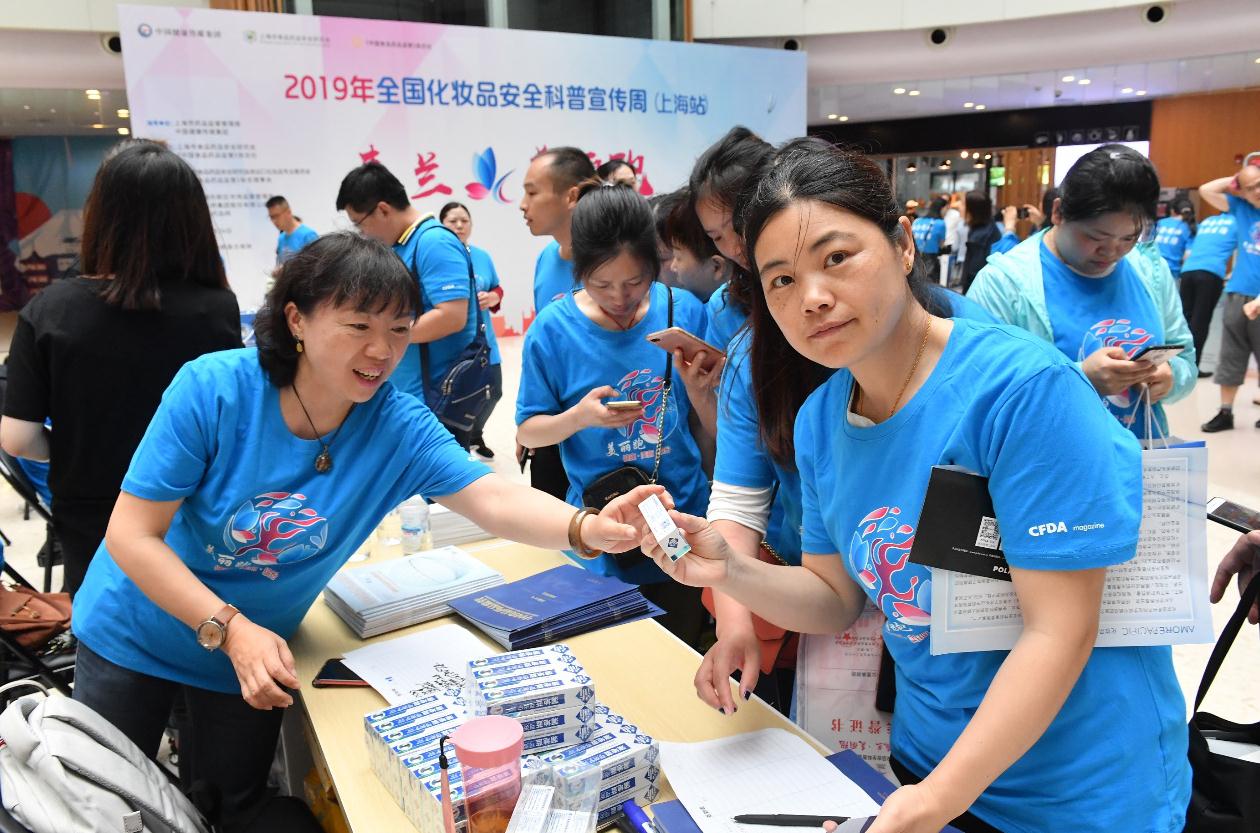 在上海市浦東新區(qū)市場監(jiān)管局設置的展臺前,身穿制服的監(jiān)管人員正在給圍觀市民講解化妝品選購常識、安全用妝、化妝品不良反應等基本知識,發(fā)放化妝品知識宣傳手冊等。