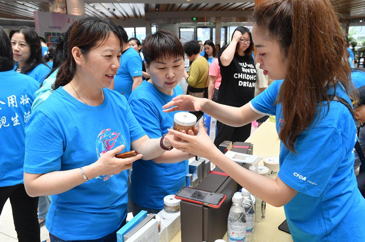 圖為市民與化妝品企業(yè)展臺工作人員互動。褚林波 攝