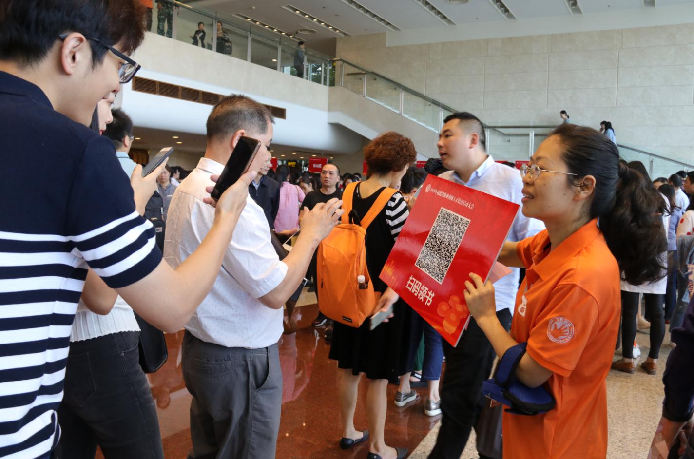 圖為與會(huì)人員正在排隊(duì)領(lǐng)取入場(chǎng)券和領(lǐng)書券。