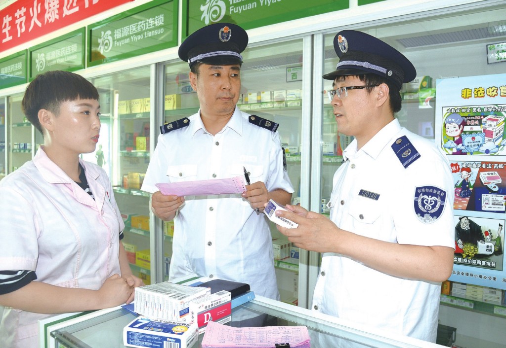 圖為執(zhí)法人員在一家藥店檢查,核對(duì)藥品進(jìn)貨票據(jù)。董寶栓 攝