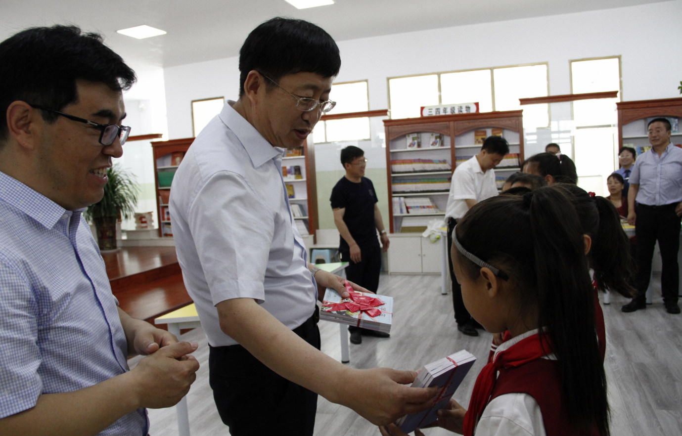 圖為晉中市食安辦主任、市市場(chǎng)監(jiān)督管理局黨組書記、局長(zhǎng)曹治勝(左二)在左權(quán)縣宏遠(yuǎn)學(xué)校向?qū)W生免費(fèi)發(fā)放食品安全知識(shí)科普讀本。