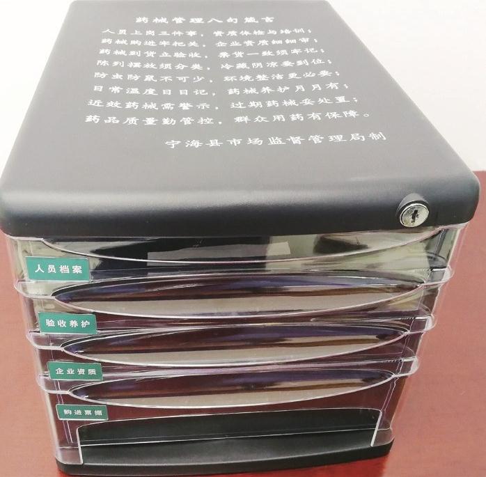 “藥械購銷票據、購進企業(yè)資質材料是各家醫(yī)療機構都必須保存的,因此我們就在臺賬盒上動腦筋?!睋幒?h市場監(jiān)管局藥械監(jiān)管所所長江慧琴介紹,該所統(tǒng)一制作了500個臺賬盒,將“八句箴言”印在盒上,免費發(fā)放給轄區(qū)內基層醫(yī)療機構,強化相關負責人和工作人員的責任意識和藥械安全管理能力。
