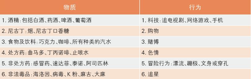 表:易上癮的物質(zhì)及行為