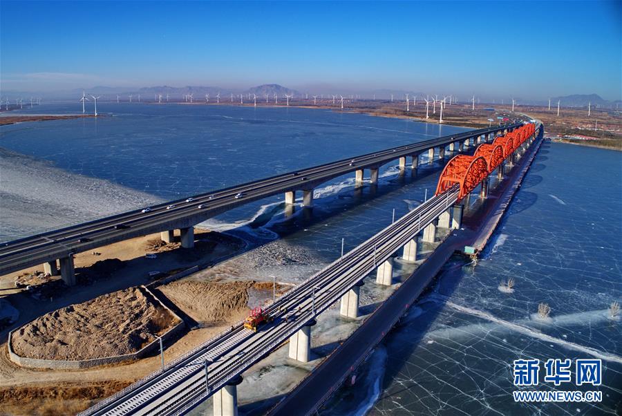 中鐵三局工人在河北張家口京張高鐵官?gòu)d水庫(kù)特大橋進(jìn)行鋪軌作業(yè)(1月13日無(wú)人機(jī)拍攝)。新華社記者楊世堯攝