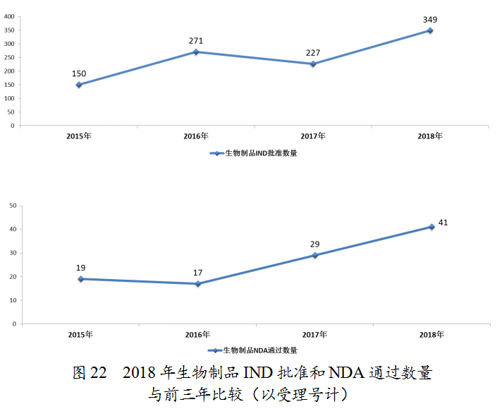 藥審中心審評通過批準(zhǔn)預(yù)防用IND 33件,批準(zhǔn)治療用IND 316件;審評通過預(yù)防用NDA 11件、治療用NDA 30件。2018年完成審評的生物制品各類注冊申請具體情況詳見表3,生物制品IND批準(zhǔn)和NDA通過量與前三年比較(以受理號計)詳見圖22。