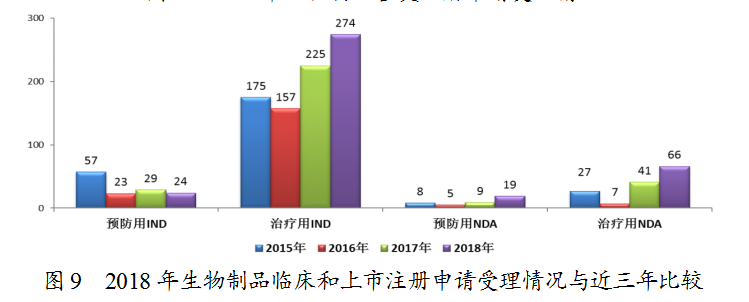 藥審中心受理生物制品注冊申請944件,其中受理生物制品IND申請298件;受理生物制品NDA 85件,較2017年增長了70%。生物制品各類注冊申請受理情況詳見圖8。2018年生物制品臨床和上市注冊申請受理情況與近三年比較詳見圖9。