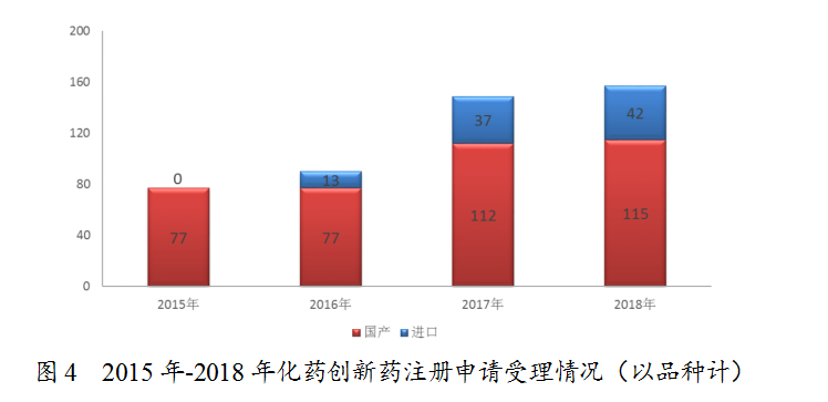 藥審中心受理1類化藥創(chuàng)新藥注冊申請157個品種,整體較2017年略有增加,其中受理創(chuàng)新藥NDA 16個品種,較2017年增長了一倍。2018年受理的157個化藥創(chuàng)新藥注冊申請中,國產(chǎn)化藥創(chuàng)新藥注冊申請為115個品種,進口化藥創(chuàng)新藥注冊申請為42個品種,2015年至2018年創(chuàng)新藥注冊申請受理情況詳見圖4。