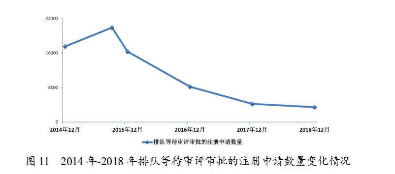 2018年底排隊等待審評審批的注冊申請已由2015年9月高峰時的近22000件降至3440件(不含完成審評因申報資料缺陷等待申請人回復(fù)補充資料的注冊申請),進一步鞏固了44號文件要求解決注冊申請積壓的成效。2014年-2018年排隊等待審評審批的注冊申請數(shù)量變化情況詳見圖11。