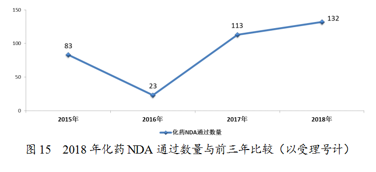 藥審中心完成審評的化藥NDA 206件,其中審評通過132件,與前三年比較(以受理號計)詳見圖15,2018年完成審評的化藥各類注冊申請具體情況詳見表1。