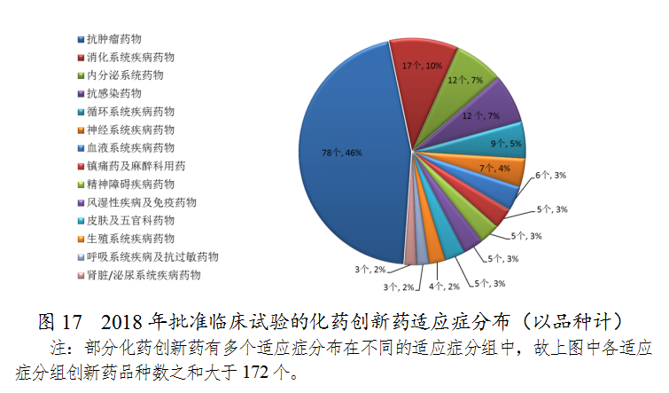 藥審中心審評通過批準(zhǔn)創(chuàng)新藥臨床試驗的172個品種中,抗腫瘤藥物、消化系統(tǒng)藥物、內(nèi)分泌系統(tǒng)藥物和抗感染藥物較多,占全部創(chuàng)新藥臨床試驗批準(zhǔn)數(shù)量的68%。批準(zhǔn)臨床試驗的化藥創(chuàng)新藥適應(yīng)癥分布(以品種計)詳見圖17。