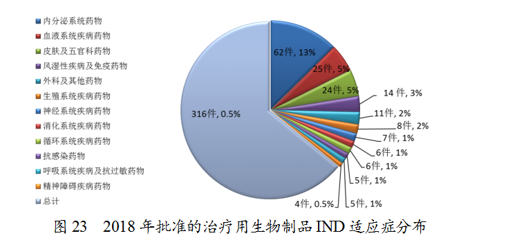 藥審中心審評通過批準(zhǔn)生物制品IND 349件,其中批準(zhǔn)的治療用生物制品IND治療領(lǐng)域分布詳見圖23。