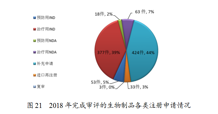 藥審中心完成審評的生物制品注冊申請共971件,其中完成預(yù)防用生物制品IND申請(預(yù)防用IND)53件,完成治療用生物制品IND申請(治療用IND)377件,完成預(yù)防用生物制品NDA(預(yù)防用NDA)18件,完成治療用生物制品NDA(治療用NDA)63件。完成審評的生物制品各類注冊申請情況詳見圖21。