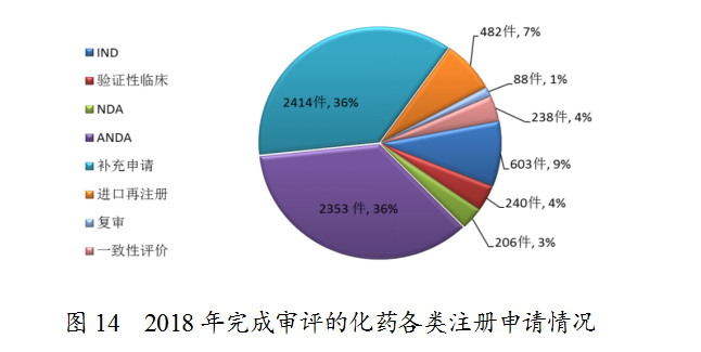 藥審中心完成審評的化藥注冊申請6624件,其中完成化藥臨床申請(IND和驗證性臨床)共843件,完成化藥NDA 206件,完成化藥ANDA 2353件。完成審評的化藥各類注冊申請情況詳見圖14。