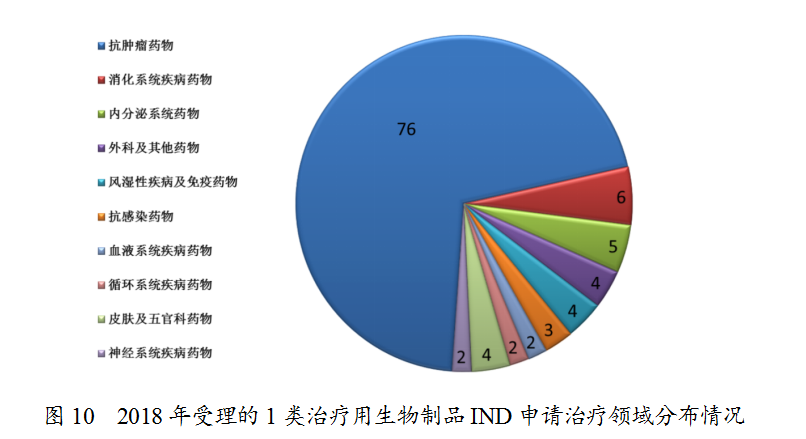 藥審中心受理1類治療用生物制品IND申請108件(涉及93個品種),適應(yīng)癥主要集中在抗腫瘤治療領(lǐng)域,占全部1類治療用生物制品IND申請的70%,具體治療領(lǐng)域分布詳見圖10。