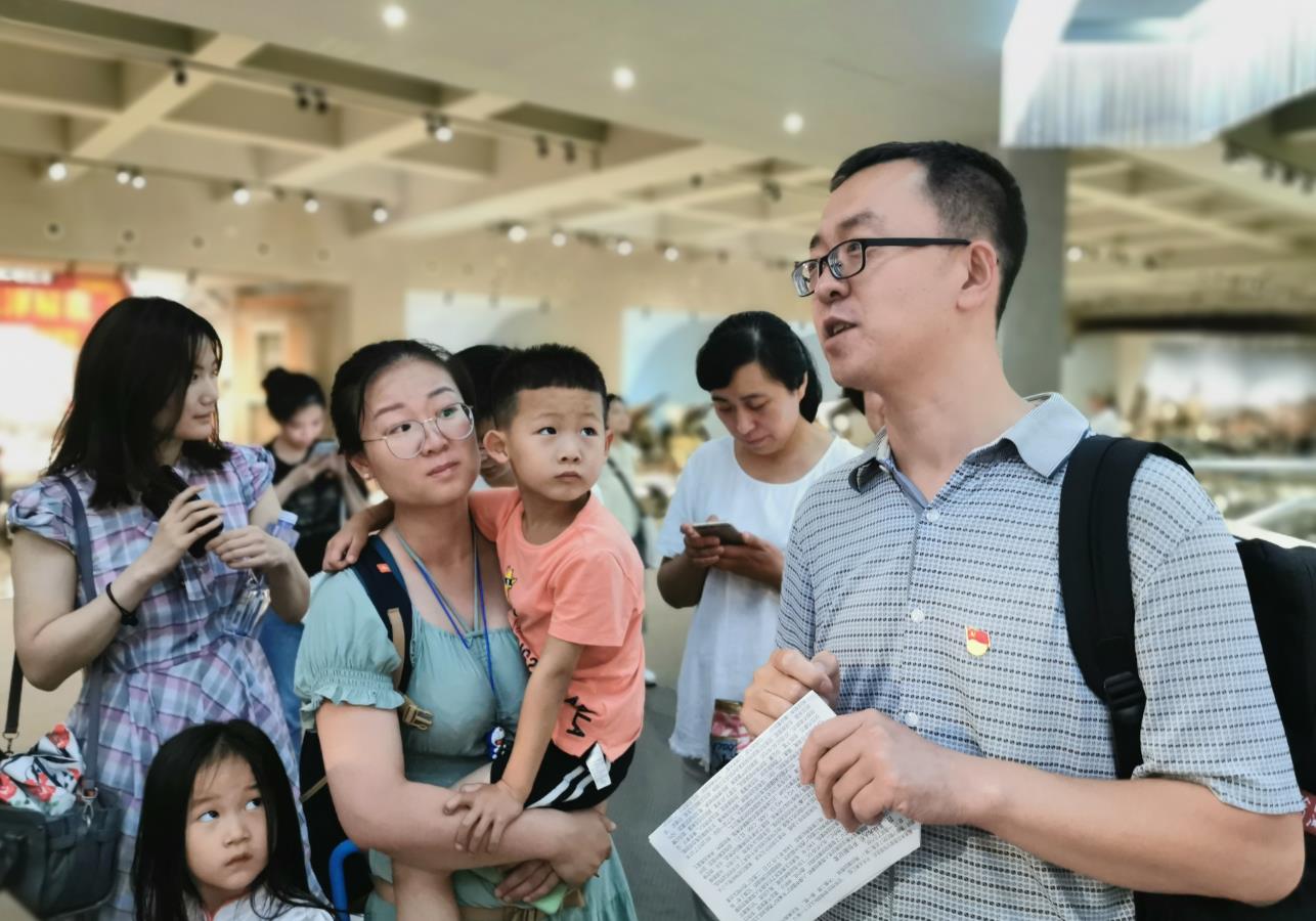 圖為展廳正在參觀的家長帶領(lǐng)孩子認(rèn)真聽黨課。張喆 攝