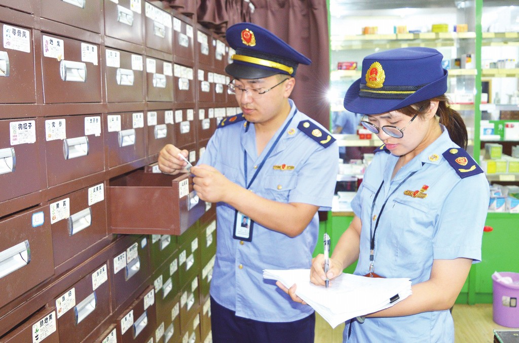 圖為執(zhí)法人員在南潯古鎮(zhèn)旅游景區(qū)的一家藥店檢查中藥飲片。孫建新 邵柳斌 攝影報道
