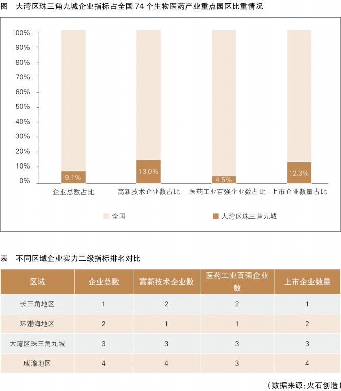 目前全國主要有4個(gè)生物醫(yī)藥集聚區(qū),分別是長三角地區(qū)、環(huán)渤海地區(qū)、大灣區(qū)珠三角九城和成渝地區(qū)。其中,大灣區(qū)珠三角九城整體實(shí)力位居第3,擁有7個(gè)重點(diǎn)園區(qū)、2個(gè)成分園區(qū),企業(yè)實(shí)力和創(chuàng)新能力位列全國第3和第4位。