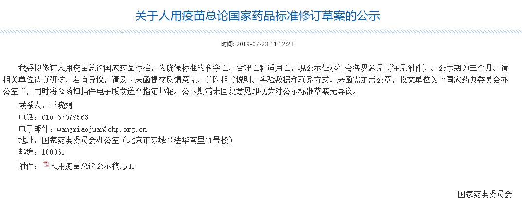 (注:關(guān)于人用疫苗總論國家藥品標(biāo)準(zhǔn)修訂草案的公示 - 國家藥典委員會(huì) http://www.chp.org.cn/view/ff8080816a583947016c1cd37e750c69?a=BZSWZP 鏈接內(nèi)附PDF為花臉版)