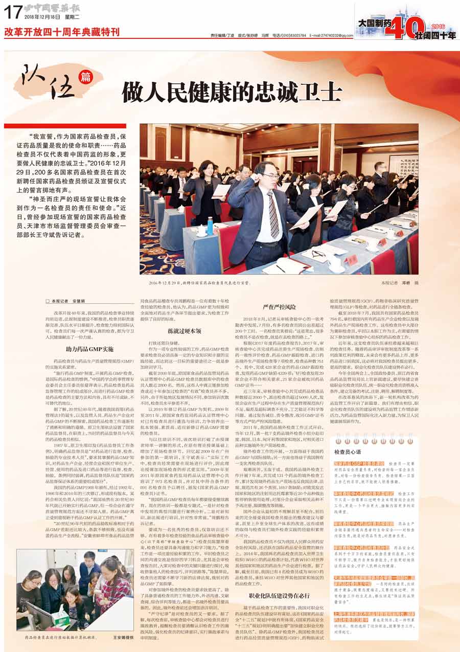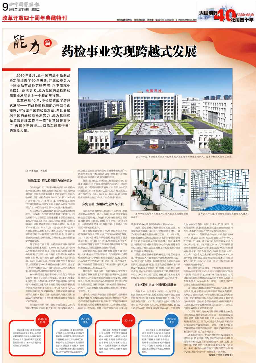 改革開(kāi)放40年,中檢院實(shí)現(xiàn)了跨越式發(fā)展——藥品檢驗(yàn)檢測(cè)能力得到全面提升,書(shū)寫(xiě)出中國(guó)藥檢新篇章,向世界展現(xiàn)中國(guó)藥品檢驗(yàn)檢測(cè)實(shí)力,成為我國(guó)藥品監(jiān)督管理工作中一支"日常監(jiān)督離不了,關(guān)鍵時(shí)刻用得上,自始至終靠得住"的重要力量。